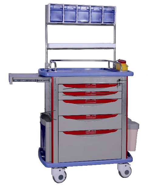 Xe đẩy gây mê có kết cấu chủ yếu làm bằng nhựa, nhôm và thép. Tấm ABS ở trên, dễ dàng vệ sinh. Khung xe thiết kế trên 4 trụ