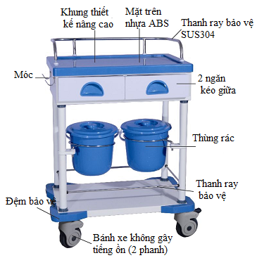 Xe đẩy khám bệnh kết cấu chủ yếu làm bằng nhựa, nhôm và thép. Tấm ABS ở trên dễ dàng vệ sinh. Khung xe thiết kế trên 4 trụ