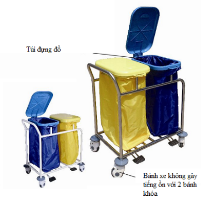 Khung xe bằng thép phủ lớp nhựa plastic bên ngoài Túi chứa chất thải loại lớn, bao gồm nắp đậy có pedal đạp chân điều khiển đóng mở Xe rất êm không gây tiếng ồn khi vận hành Nắp đậy bằng nhựa ABS